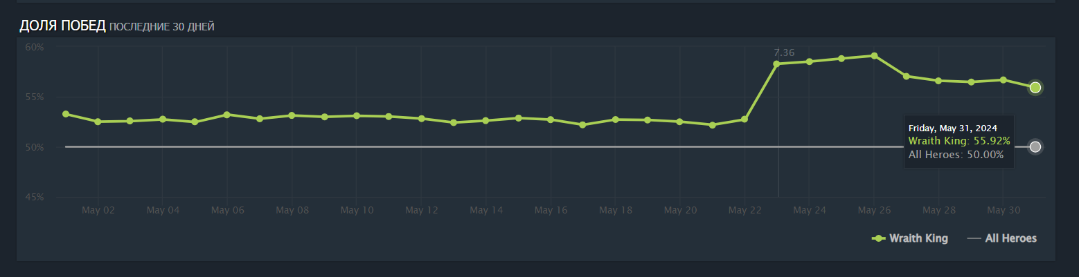 Да, “Папич” вновь вернулся в строй самых сильных героев. Врожденной способностью WK стали его вампиризм и неуязвимая призрачная форма после смерти, как от Aghanim’s Scepter. То есть Wraith King получил врожденный аганим с нулевой минуты. Сам же скипетр, как и раньше, делает скилл аурой, но теперь еще и уменьшает время возрождения союзников на 10%. Аспекты у героя тоже очень сильные и входят в топ-5 по винрейту. И если Bone Guard просто возвращает скелетиков, то Spectral Blade, который берут в три раза чаще, увеличивает личный DPS “Короля” благодаря новой способности с отложенным уроном. А дамаг этот зависит от тычки персонажа. Поэтому рапира на WK смотрится еще более заманчивой. Тем более никто не отменял неуязвимость в виде призрака на пять секунд. И даже после смерти можно легко устроить рампагу.