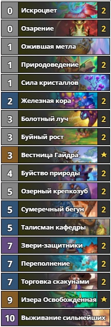 После выхода карты Звери-защитники она стала практически обязательной во всех колодах друида. Сейчас много играбельных вариаций дек этого класса, и с Кель’тасом, и с Малигосом, но мы выбрали самую дешёвую и простую. Основным условием победы этой колоды является ранний разгон по мане и быстрый захват стола при помощи зверей-защитников или торговки скакунами. Большое количество добора карт позволяет эффективно раскрываться в колоде Изере Освобождённой. Стоимость этой сборки невелика – всего 5780 пыли. Если Вам нравится хайроллить и смотреть, как соперники сдаются на четвёртый ход, то эта колода создана специально для вас.