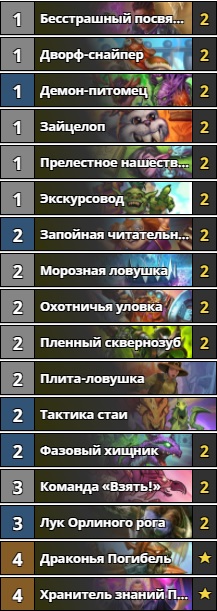 Открывает наш топ дешёвая дека агрессивного ханта. Эта колода стоит всего лишь 4780 пыли, хотя можно найти вариации лишь с одной легендаркой в районе 3000. Очень проста в применении, подойдёт как новичкам, так и опытным игрокам. Благодаря короткой средней продолжительности игры и высокому винрейту – это, пожалуй, самая быстрая дека для взятия заветной легенды. Условие победы очень простое – захватить контроль над столом на самом старте и методично пробивать лицо оппонента. Зачастую более медленные колоды не успевают противопоставить что-то такой тактике, и игра завершается за 5-7 ходов. Если Вам нравится простой геймплей с постоянным пробитием лица оппонента, то обязательно стоит попробовать эту колоду.