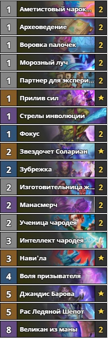 У быстрого мага сейчас второе дыхание. После засилья хайлендер-магов в прошлом обновлении ему на смену пришёл другой архетип. Пожалуй, это наиболее нестабильная дека в нашей подборке, ведь многое в ней зависит от рандома. По геймплею чем-то напоминает старую добрую miracle-разбойницу. Огромное количество ресурсов для победы позволяет выигрывать абсолютно разными способами. Эта колода довольно дорога – 11060 пыли, но за эту цену вы получите огромное количество полярных впечатлений. Если вы, как и отец Hearthstone Бен Броуд, считаете, что элемент случайности в игре – это очень весело, то эта дека вас точно не разочарует.