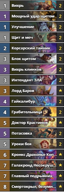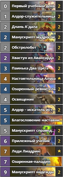 Продолжает наш топ колода защитника света. Благодаря высокой синергии между классовыми картами и бафу манускриптов именно архетип pure-паладина преобладает над всеми остальными в ладдере. Эта темпо-дека довольно проста в исполнении и в чём-то напоминает колоды, собранные на арене. Ценность у нее средняя – 7220 пыли. Правда эта колода имеет довольно ограниченный потенциал условия победы. И зачастую на высоких рангах соперникам удаётся распределить свои ресурсы так, чтобы оставить паладина не у дел. Против темпо колод у этой сборки есть две комбинации из манускрипта справедливости и освящения. Против фейс-колод есть 2-4 лечения от манускрипта надежды. Если Вы предпочитаете простые и надёжные деки, то эта колода для вас.