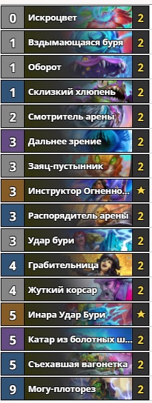 Шаман получил несколько хороших карт в этом дополнении, а архетип с эволюцией сразу стал грозой меты. “Инара Удар Бури” и “Удар бури” дали колоде необходимый burst-урон, а “Оборот”, “Съехавшая вагонетка” и “Смотритель арены” улучшили темп этой деки. Представленная сборка стоит 6360 пыли, что не слишком дорого, но и не очень дёшево. Условия победы этой колоды довольно просты и понятны — проспамить стол существами с низкими статами и эволюционировать их. Зачастую оппонент просто не сможет зачистить сильный стол несколько раз. Ещё одним залогом победы является множество быстрого урона и возможность добить соперника с небольшим запасом здоровья. Если вы считаете, что элемент случайности — это очень весело, или раньше играли на старом эвольв-шамане, то эта колода точно для вас.