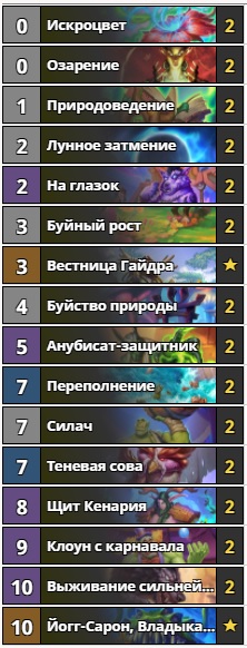 Вместе с дополнением “Ярмарка безумия” в игре появились карты с новом свойством — “Порча”. Их особенность в улучшении существ и заклинаний в руке при разыгрывании более дорогих карт. На этом свойстве основан геймплей колоды. Как и всегда, важным элементом в тяжёлых деках друида является разгон по мане. Тяжёлые карты с порчей, такие как “Силач”, “Щит Кенария” и “Клоун с карнавала”, активируются “Выживанием сильнейших”. Также в колоде есть “Йогг-Сарон, Владыка судьбы”, позволяющий вернуться в игру в самых тяжёлых ситуациях. Стоимость этой колоды довольно велика, аж 8000 пыли. Если вам нравится геймплей тяжёлого друида с постепенным разгоном в начале игры и заспамом стола тяжёлыми существами в конце, то эта колода для вас.