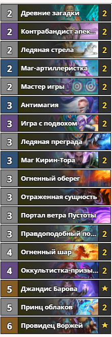 Ещё один архетип, заигравший в этом дополнении. Много burst-урона и масса добора делают эту колоду очень быстрой и довольно агрессивной. “Игра с подвохом” и “Провидец Воржей” решили проблему с тем, что карты в руке секрет-мага заканчиваются, а “Оккультистка-призывательница” улучшила темп деки. Стоимость этой сборки средняя — 6680 пыли. Win-condition состоит в том, чтобы получить контроль над столом вначале партии, а потом добить соперника “Огненными шарами”, “Ледяными стрелами” и “Принцем облаков”. Если вам нравится ставить соперника в тупик секретами и вы предпочитаете темповый стиль игры, то эта колода для вас.