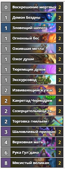 Колода Зоолока тоже не претерпела больших изменений, получив три пары новых карт. “Извивающийся ужас” и “Зловещий шепот” помогают захватить контроль стола, а “Шаловливый призрак” сбивает темп оппонента. Эта дека является самой дешёвой в нашем обзоре — 4940 пыли. Игра с такой колодой проста: необходимо захватить стол и производить только ценные трейды, отправляя оставшуюся часть урона существ в лицо оппонента. Зоолок всегда актуален в той или иной степени. Это уже классика, ведь первые чернокнижники с заспамом стола появились ещё на заре Hearthstone. И если вы играете давно, то время вернуться к истокам. Новичкам колода тоже подойдёт благодаря невысокой цене.