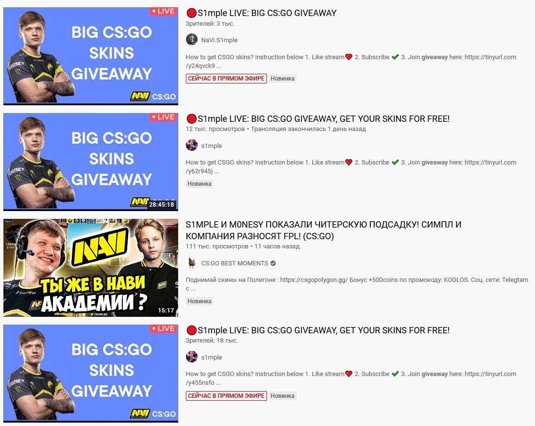 В 2020-м году S1mple сам косвенно пострадал от мошенников. Игрок рассказал, что его именем начали прикрываться мошенники. В октябре Александру написал зритель, который зашел на стрим с бесплатными скинами, который якобы проводил украинец. Участие в раздаче обернулось кражей аккаунта Steam и всех вещей с учетной записи. Приблизительно в то же время было найдено несколько фейковых трансляций S1mple.