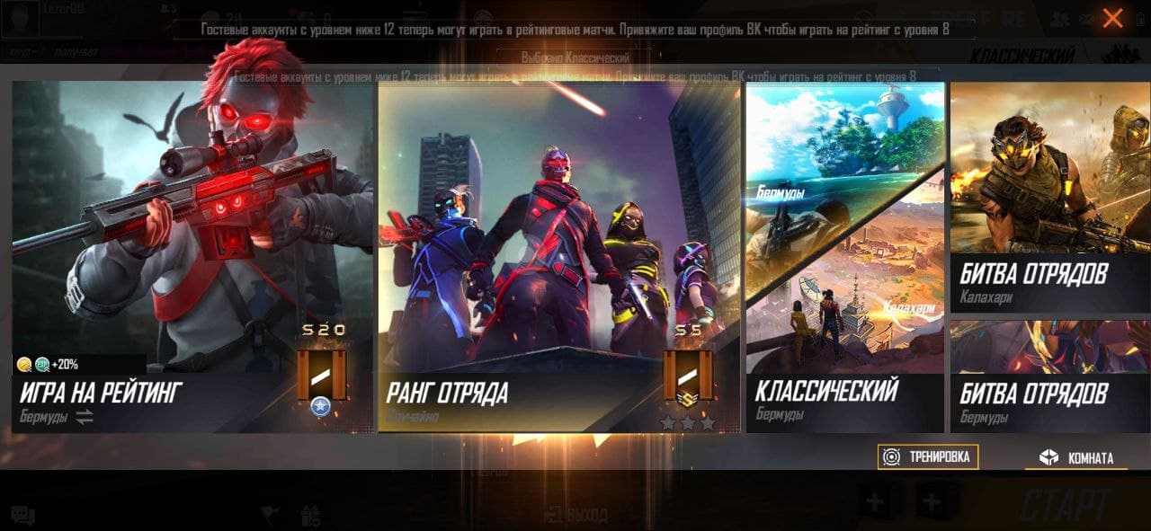 Играть во Free Fire можно как одному, так и в составе группы. Всего здесь две карты: Бермуды и Калахари. В зависимости от количества игроков в команде доступно три режима: Классический (соло), Битва отрядов (с другом) и Командная битва насмерть. Кроме того, побороться можно и в рейтинге.