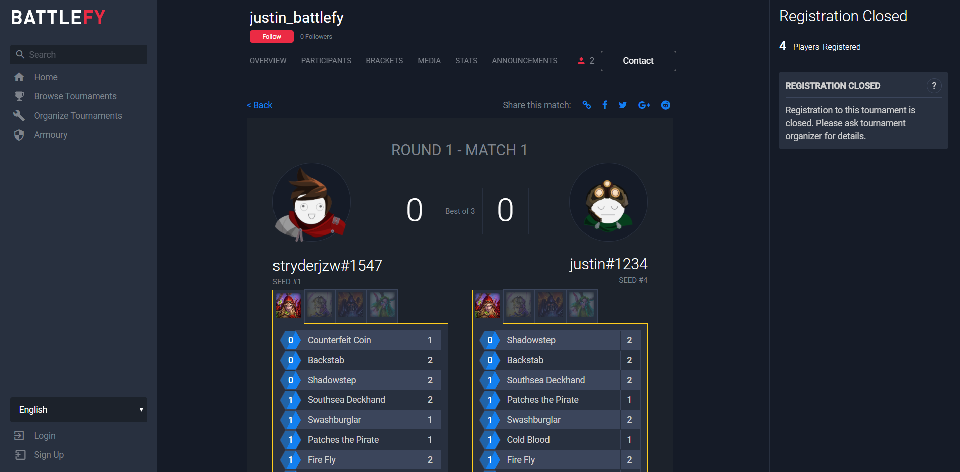 Хоть со стороны организаторов все было отлично, но техническая часть турнира хромает. В первую очередь из-за платформы с сеткой, в нашем случае использовалась www.toornament.com, куда счет заносился вручную. Да, с одной стороны, это хорошо, что все данные в руках менеджеров, а игрокам достаточно написать в VK. Но с другой — удобнее всего делать все это самому прямо внутри интерфейса площадки. Для этого лучше подходит Battlefy. Тут без проблем можно и скрины колод приложить, и c оппонентом связаться, и счет отправить со скриншотами. Подобное, например, используется в Минской таверне.