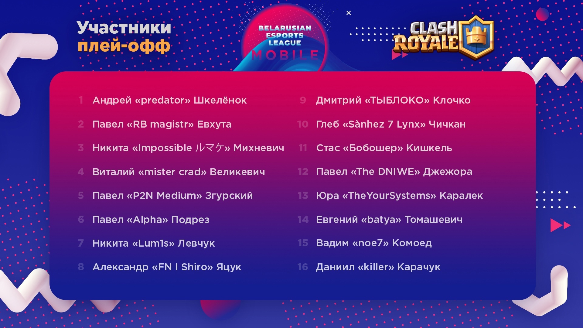 Финальная часть турнира собрала в одном месте не только простых любителей игры, но и многих топовых игроков, входящих в состав сборной Беларуси. БОБОШЕР, Lum1s, mister crad и predator совсем недавно принимали участие в чемпионате мира по Clash Royale. А P2N Medium, ТЫБЛОКО и все те же БОБОШЕР и predator стали лучшими в своих регионах на Спартакиаде киберспорта Беларуси. Именно они были фаворитами чемпионата.