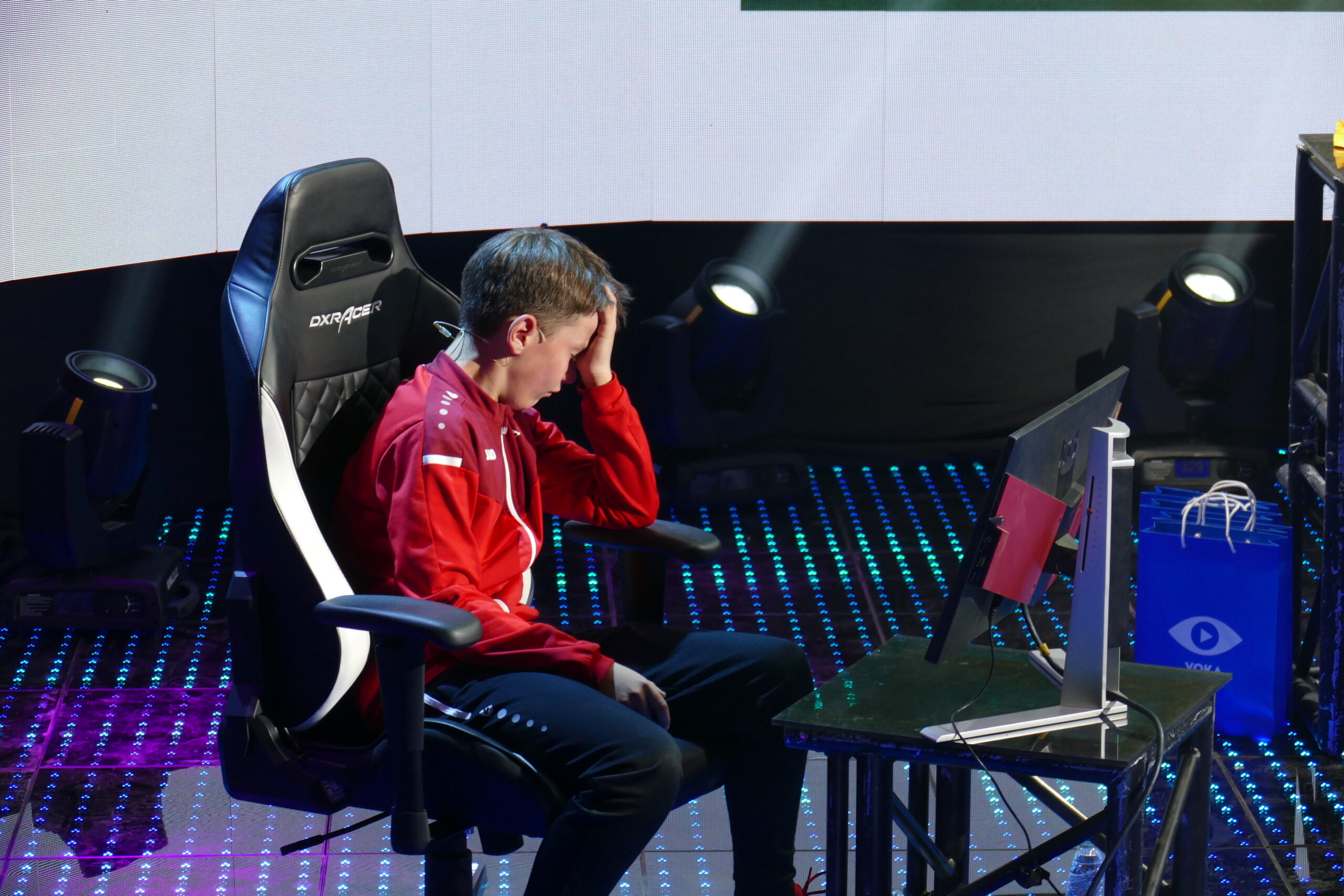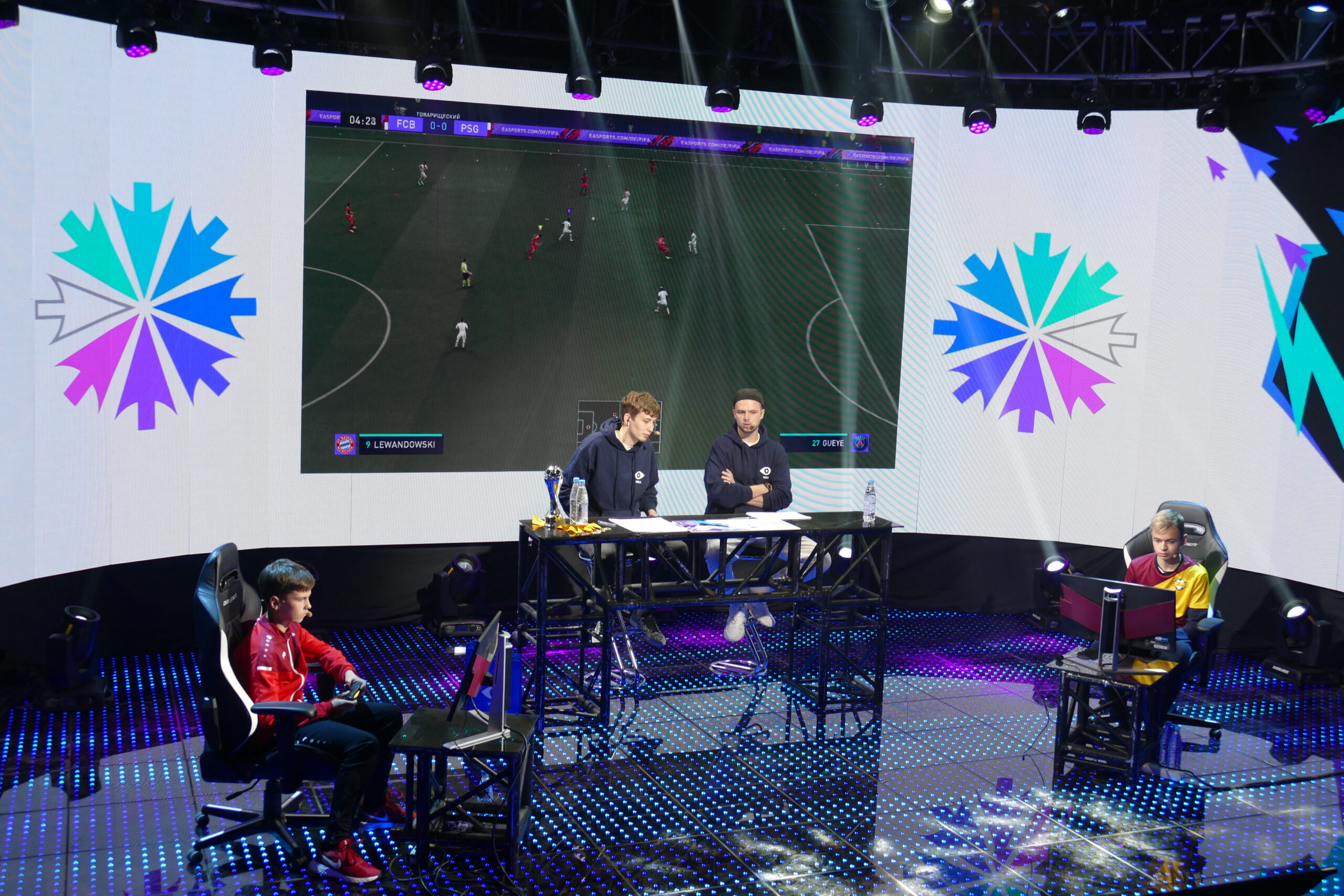 Всего в турнире по виртуальному футболу принимали участие 12 ребят. Но на главную сцену и экраны попали только участники полуфиналов и финала. Матчи с участием четверки лучших проходили в импровизированной студии на окраине Минска. И пусть играли в FIFA здесь дети, но соревноваться им пришлось в самых боевых киберспортивных условиях: яркая сцена, соперник напротив, комментаторы в шаге и, конечно, самые преданные болельщики — родители — за кулисами. Добавляем сюда прямую трансляцию и получаем среду непростую даже для профессиональных игроков.