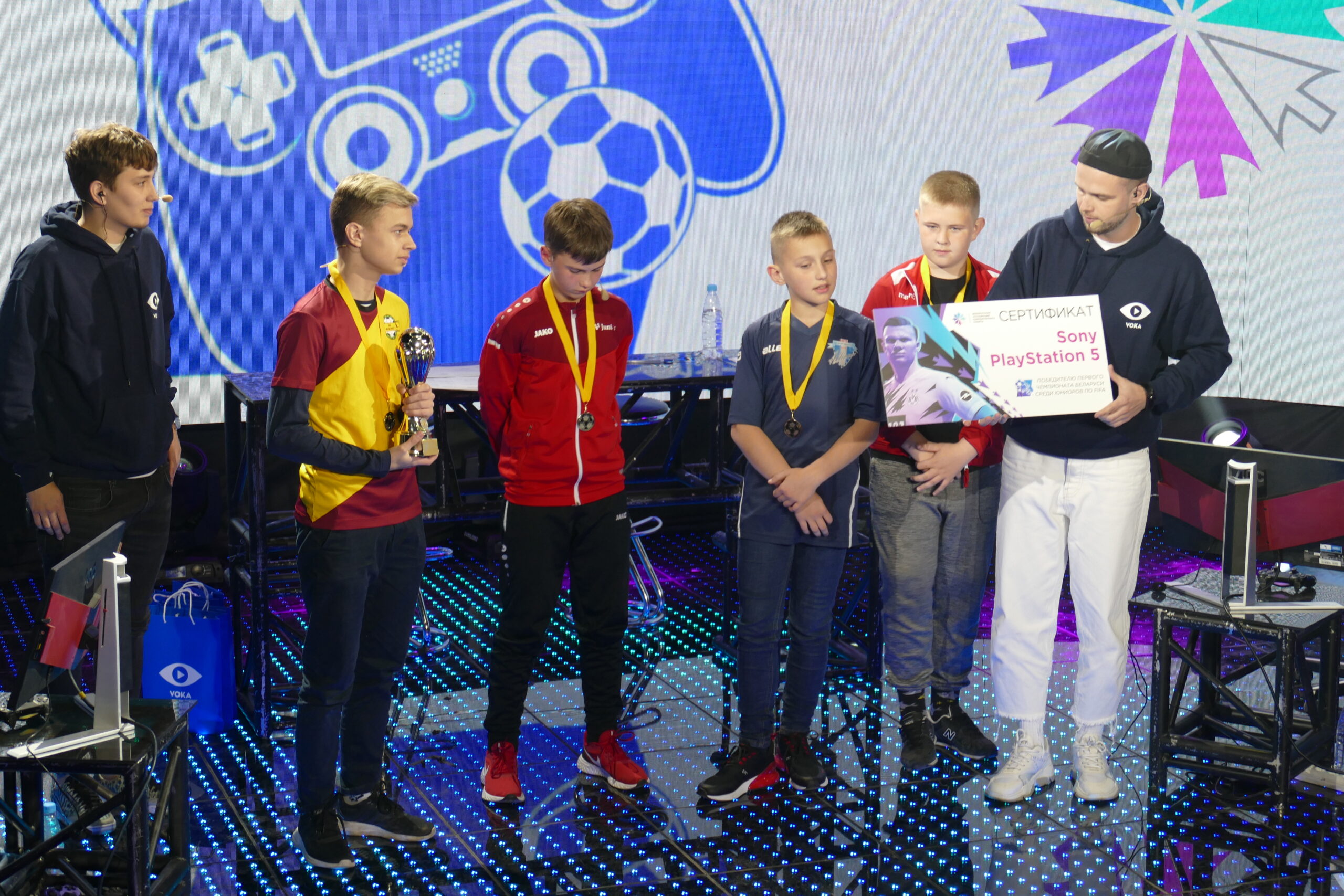 Юные участники и правда, будто взяли все лучшие от двух миров — футбольного и киберспортивного. Они демонстрировали уважение к соперникам, подбадривали друг друга в трудные минуты и при этом уверенно держались на сцене. Вы только представьте, парни 9-14 лет боролись за дорогущий главный приз (порой и взрослые турниры по FIFA в Беларуси не могут похвастать PlayStation 5 в качестве главной награды) и при этом слышали в режиме “real time”, как их действия обсуждают комментаторы. Если бы Криштиану Роналду слышал из громкоговорителей на стадионе, как каждый его шаг анализируют эксперты, он бы еще в молодости лишился от нервов своей лоснящейся нагеленной шевелюры. А тут дети.