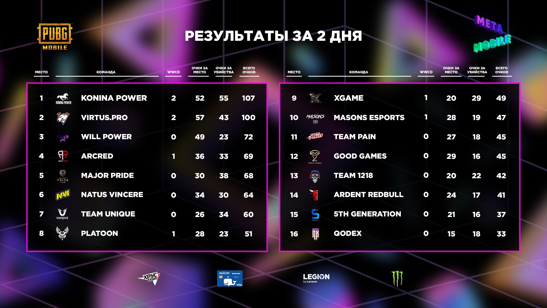 Закончив первый матч всего с одним очком, команда Konina Power начала разгоняться по ходу турнира и завершила стартовый день на первом месте. Следом за ней с минимальным отрывом расположились NaVi, Virtus.pro и PLATOON. Во второй день казахстанская команда только наращивала преимущество и закономерно стала чемпионом турнира.
