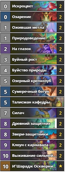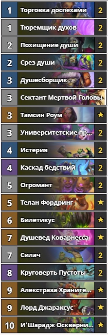 Из-за обилия колод агрессивной направленности в ладдере на арену снова вышел контроль чернокнижник. Концепт остался схож с варлоком из нашего январского обзора — сжечь как можно больше карт “Билетикусом” под “И’шараджем Осквернителем”. Большое количество зачисток, лечения и заклинаний, способных дать контроль над столом, помогают дожить до стадии, когда колода расцветает. Стоимость деки выше среднего — 8360 пыли. Но собрать ее есть смысл, ведь такой набор карт не теряет актуальность уже очень давно. В том или ином виде этот архетип постоянно появляется в ладдере и показывает там весьма приличный винрейт.