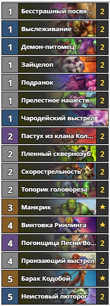 Что-то модно, что-то вышло из моды, а что-то вечно. К третьей категории относится архетип агрессивного охотника. По сравнению с прошлым месяцем произошло две замены. Вместо “торговки ножами” и одной копии “чародейского выстрела” были добавлены два “топорика головореза”. Эта вариация охотника стоит 7280 пыли и имеет долю побед в 66 процентов. Благодаря короткой средней продолжительности игры и высокому винрейту — это, пожалуй, одна из самых быстрых дек для взятия заветной легенды. Условие победы очень простое — захватить контроль над столом на самом старте и методично пробивать лицо оппонента. Зачастую более медленные колоды не успевают противопоставить что-то такой тактике, и игра завершается за 5-7 ходов. Если вам нравится простой геймплей с постоянным пробитием лица оппонента, то обязательно стоит попробовать эту колоду.
