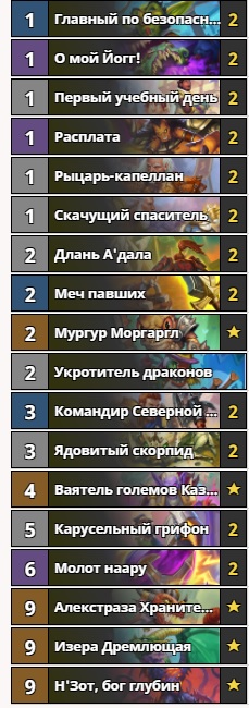 Секретный паладин из прошлой подборки получил ряд нерфов, но это не помешало классу остаться сильнейшим. Теперь первую скрипку среди воинов света исполняет паладин на зверинце. Это мощная темпо-колода, с неплохим добором карт. Геймплей довольно прост, нужно выставлять карты мощной начальной игры, и если не получится задавить сразу, то в лейте вам помогут это сделать “Мургур Моргаргл” и “Н’Зот, бог глубин”. Стоимость колоды — 7520 пыли. Пожалуй, это одна из самых простых и надёжных дек для взятия легенды в этой мете.