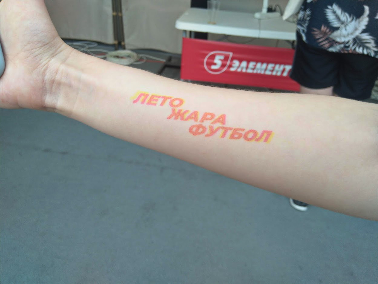 У тех, кто вылетел из соревнований или просто проходил мимо, была возможность поиграть в FIFA на Xbox One. А для настоящих олдов присутствовал уголок ностальгии — легендарная PlayStation 1 с файтингами Mortal Kombat и Tekken. На этом список активностей не заканчивался. Благодаря тату-принтеру, предоставленному сетью магазинов “5 элемент”, буквально за несколько секунд можно было стать счастливым обладателем временного рисунка на коже. Фанаты сборных Италии и Англии наносили флаги своих фаворитов, а люди, болеющие просто за красивый футбол, украшали себя нейтральными надписями.