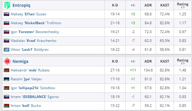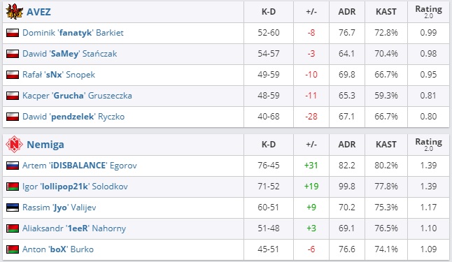 Также с рейтингом выше единицы новичок Nemiga завершил противостояние с украинцами из Trasko. По итогам двух карт этот показатель достиг отметки 1,07.