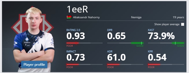 Дебютным поединком для Александра стало противостояние с польским коллективом AVEZ. За три карты игрок отметился 51 убийством и 48 смертями. Рейтинг CS-ера за серию составил 1,10. А на Inferno он достиг 1,38. Эти показатели являются лучшими для 1eeR на момент публикации.