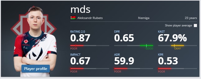 В целом средняя статистика очень схожа с показателями 1eeR. Но стоит сделать поправку на то, что mds играл RMR-турнир против сильнейших команд региона. А выступать против NaVi и Gambit обычно не слишком полезно для статистики.