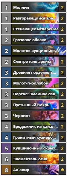 Одна из самых дешевых и популярных колод дополнения. Отличается от августовской вариации всего лишь двумя картами. Вместо одного “Молотка аукциониста” и “Инструктора Огненное Сердце” в сборку вернулись две копии “Грозового облака”. Все-таки ценность случайных элементалей все еще слишком высока, чтобы игнорировать эту карту. Изменения уменьшили и без того невысокую стоимость колоды: теперь для ее крафта достаточно 2060. Рекомендуется как новичкам, так и опытным игрокам, любящим действовать первым номером.