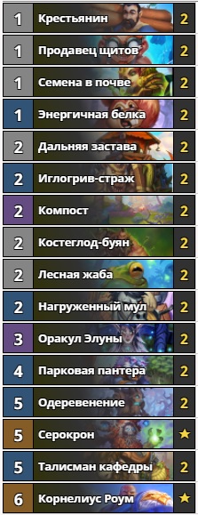Дека появилась в ладдере совсем недавно, но уже выглядит одним из самых главных кандидатов на нерф. Прекрасно играет с большинством популярных архетипов, ведь мало кто сейчас выполняет зачистки стола (исключение — квест-маг). При помощи “Дальних застав” отлично ломается темп всех других быстрых колод. Имеется огромное количество добора карт при помощи “Компоста” и “Корнелиуса Роума”. “Иглогрив-страж” и “Оракул Элуны” позволяют захватить контроль стола и не отпускать его всю игру. Стоимость колоды средняя — 6480 пыли. Единственным недостатком деки является потенциальный нерф. Так что поспешите скрафтить.