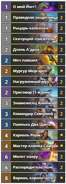 Сборка паладина на “забафе” карт в руке уступила место гибриду с секретами: слишком сильными картами оказались “О мой Йогг” и “Скачущий спаситель”. В целом суть колоды осталась прежней — сильный темп и давление в мидгейме. Главным недостатком сборки осталась ее стоимость: 10000 пыли готов выложить не каждый.