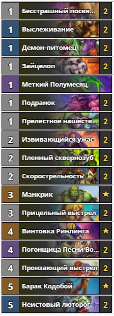 Нерф “Пастуха из клана Колгар” сказался на охотнике не в лучшую сторону. Но у него достаточно хороших карт, которые не помещались в колоду раньше. Вместо эпиков, ставших неиграбельными, вернулись старые-добрые “Пленные сквернозубы”. Благодаря этому дека немного подешевела — представленная вариация стоит 7040 пыли.