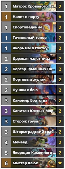 Агрессивная недорогая сборка вара. “Мистер Каюк” и “Пушки к бою” увеличили темп и уровень агрессии этой колоды до колоссального. Даже старый воин на пиратах до нерфов мог бы позавидовать пробитию лица этой декой. Стоимость относительно невелика — 4360 пыли. А винрейт в ладдере составил 63.8 процента. Если вы любите старые добрые колоды в духе фейс-хантеров, то эта сборка вам подойдет.