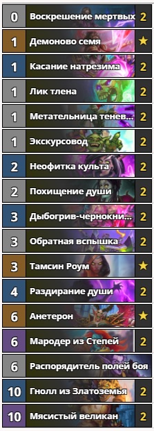 Квестовый чернокнижник вернулся в мету с появлением “Анетерона”. Хотя колода на усталости в мете агрессии не очень хороша, но даже в таких условиях она показывает винрейт в 64.8 процентов. Стоимость деки средняя — 7760 пыли. В отличие от большинства других метовых архетипов — эта колода требует хорошего менеджмента ресурсов. И при должном умении игрока способна показывать блестящие результаты. Но для этого необходимо сыграть достаточно много игр, ведь порой нужно принимать не очевидные решения.