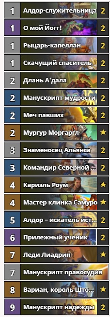 Сборка, которая кошмарила ладдер еще в прошлом месяце. Представляет собой гибрид популярных колод из прошлого. У паладина очень много сильных существ и заклинаний, простор для комбинаций и создания новых вариаций огромный. В этой колоде грамотно подобраны карты, синергирующие и с манускриптами, и с секретами. Винрейт у такого воина света повысился до 65,8 процента. А вот главным недостатком является большая стоимость — 11 640 пыли.