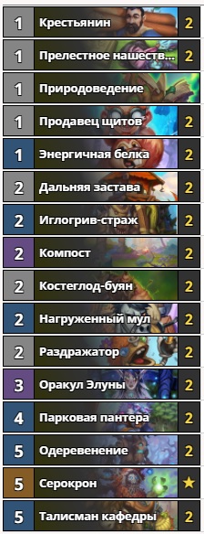 А вот друид не получил новых карт в мини-дополнении, но все равно остался в мете. Однако винрейт снизился до 66 процентов. “Дальние заставы”, хорошо показывающие себя против воинов и чернокнижников, заменили неофиток культа. Стоимость колоды составляет 4840 пыли. Быстрый темп, задаваемый этой декой, выдержать могут далеко не все. До выхода мини-обновления этот архетип останется самым доминирующим в ладдере.
