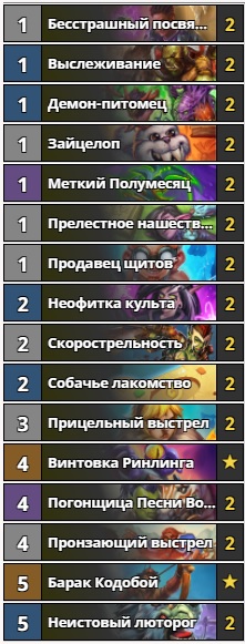 “Собачье лакомство” стало мощной картой, помогающей ускорить темп охотника и контролировать стол. Эксперименты с добавлением новых карт типа “Лунной волчицы” закончились. Поэтому сборка заметно подешевела — и сейчас ее можно скрафтить за 6080 пыли. Геймплей деки остался прежним — захватить инициативу в ранней игре и добить оппонента наиболее тяжелыми картами в этой сборке.