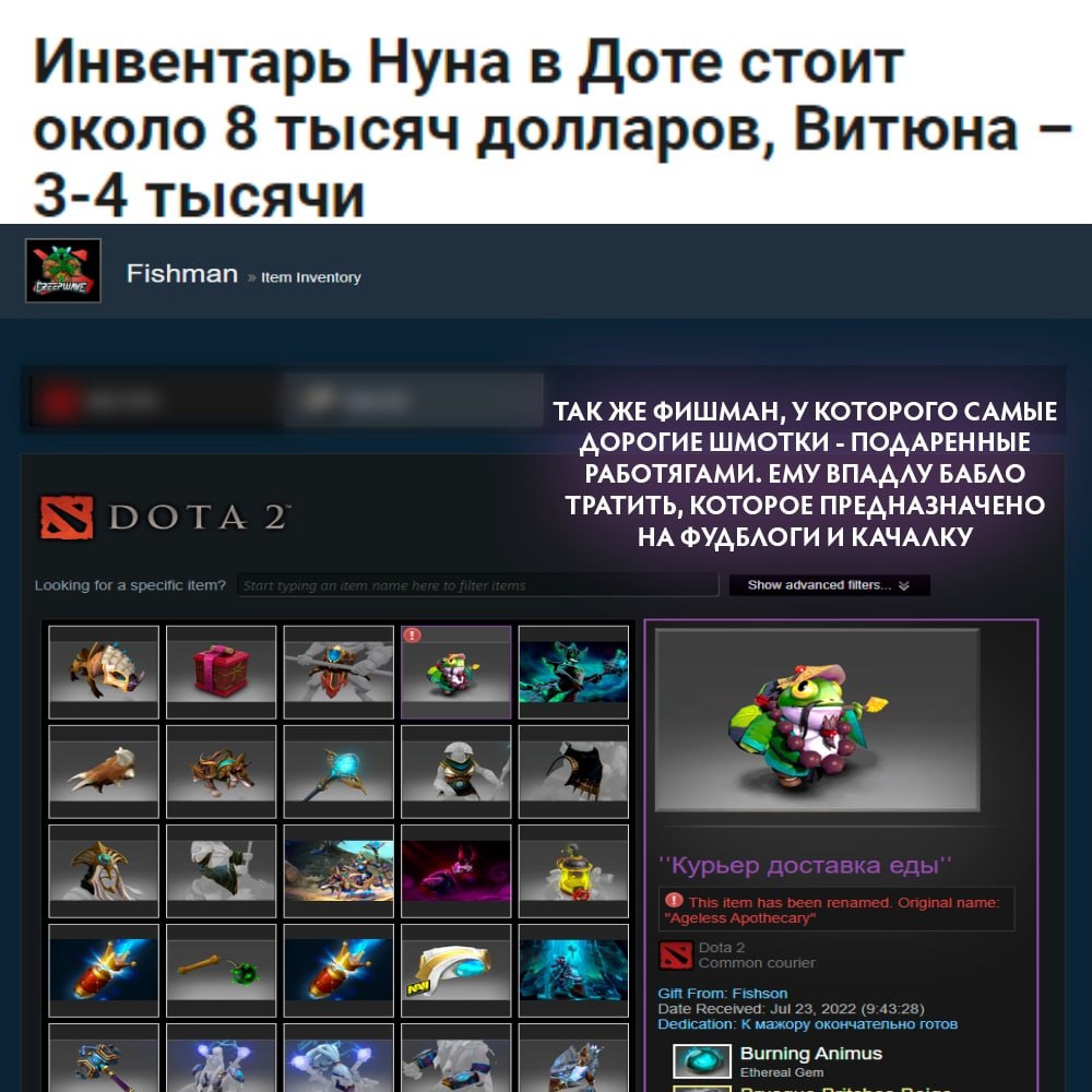 Владислав: “Все, что есть в меме – правда. У Fishman нет дорогих шмоток в инвентаре и он их не покупает, все дарят фанаты, а он с удовольствием эти шмотки носит. Курьера, кстати, подарил я и подписал его “Курьер доставка еды”. Теперь если во время игры кликнуть на его курьера, то там будет это название. На immortal ракете Clockwerk, которую также подарил я, кстати, название “ФАНАТЫ ФИШМЕНА ПОДПИШИСЬ”. Спасибо Дима, что не убираешь эти глупые названия и носишь шмотки ребят, которые дарят их тебе“.