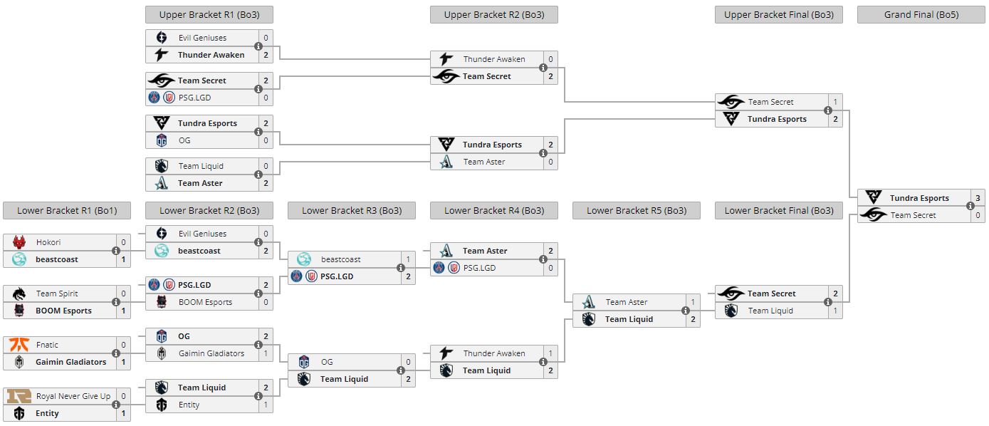 Будущие чемпионы делали выпады, забирали пару вражеских персонажей и отходили, не давая противнику что-то осознать и как-то отреагировать. Ставка делалась в основном на активный мид-гейм, но запасной вариант с масштабным сражением в лейте тоже был. Такому плану с двойным дном противостоять невероятно трудно. В плей-офф только Team Secret смогла отжать карту у Tundra, но позже все равно проиграла в гранд-финале уже 0:3. Без вариантов.