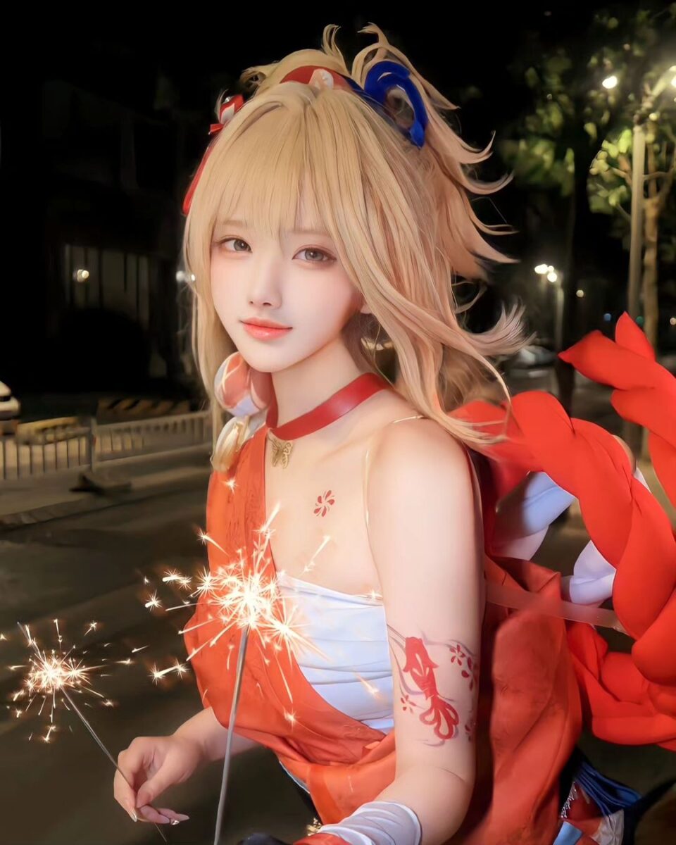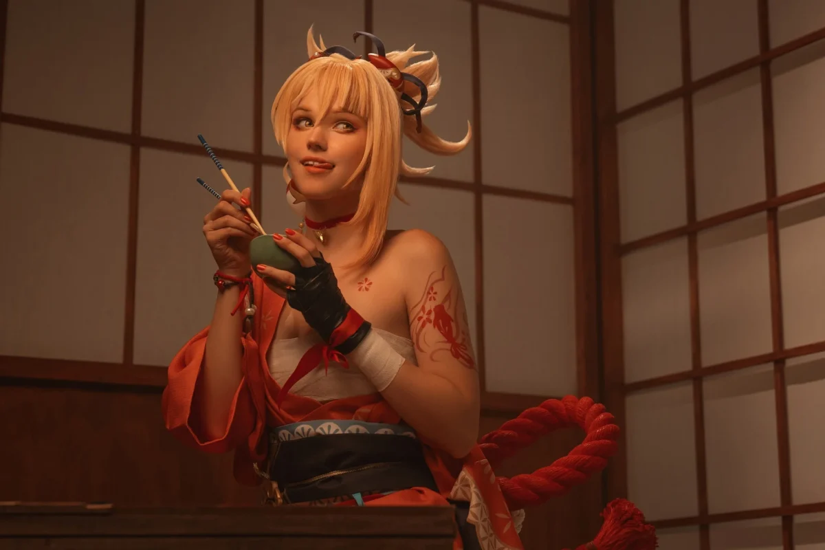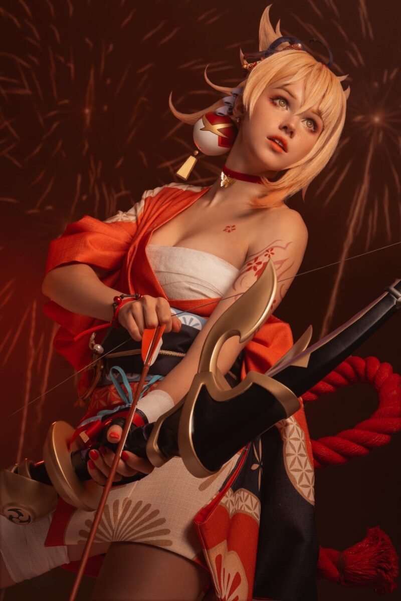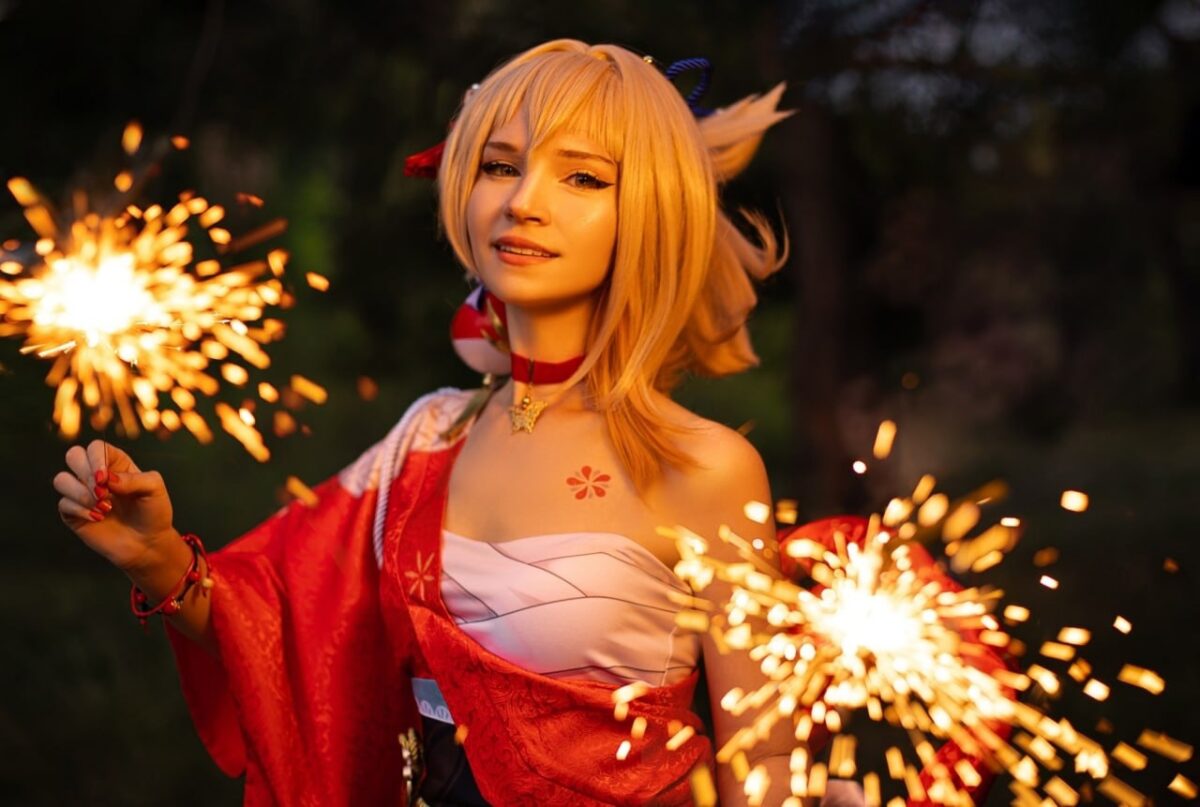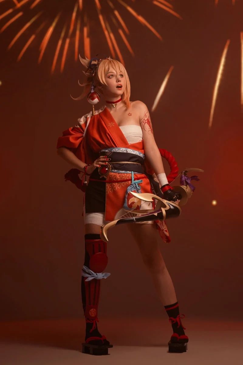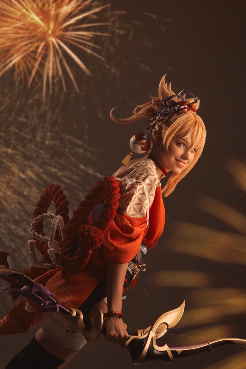 Еимия, или же “Королева праздника лета” — одна из самых ярких представительниц стихии Пиро в Genshin Impact. Фанатка праздничных мероприятий славится своей любовью к фейерверкам и торжествам. Приятный образ вкупе с мощным стрелковым оружием делает из нее восхитительного бойца. К вашему вниманию восхитительный косплей на владелицу “Фейерверков Наганохары“.