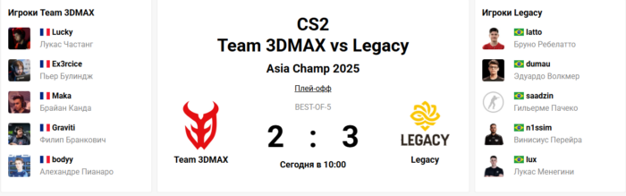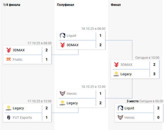 Legacy стартовали мощно, выиграли первую карту уверенно, но 3DMAX ответили двумя картами подряд. Решающие карты показали, что бразильцы смогли собраться и довести дело до победы — особенно впечатлили их рейды на Ancient.
