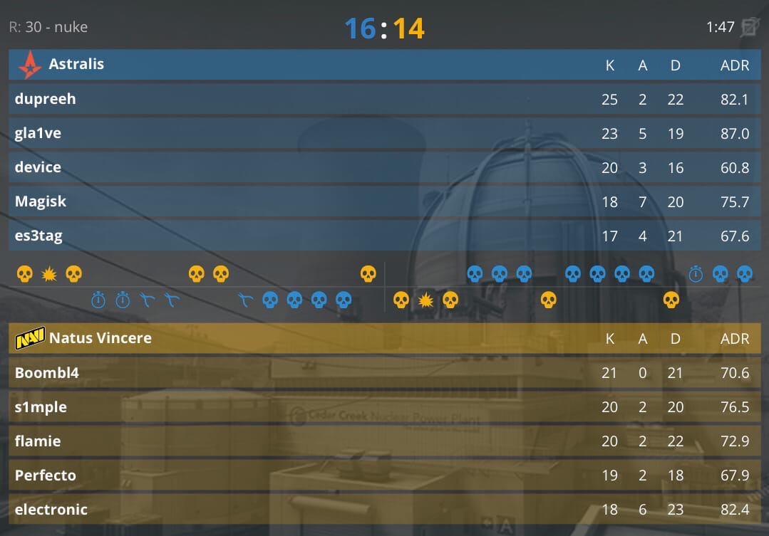 Astralis выиграли карту Nuke у NaVi в финале со счётом 16-14, сотворив камбэк с 12-6 на ESL PRO League. Следующая карта Train — пик команды NaVi.