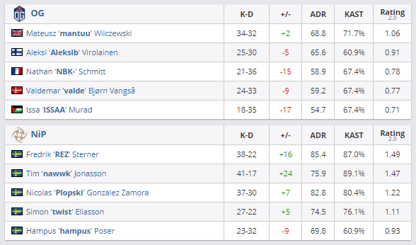 Ninjas in Pyjamas обыграли OG в матче нижней сетки DreamHack Open Fall 2020 по CS:GO. Матч закончился со счетом 2:0, таким образом NiP вышла в следующий раунд плей-оффа.