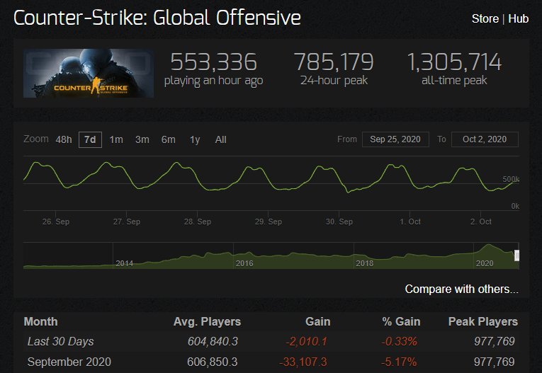Во время начала пандемии CS:GO занимал лидирующие позиции по онлайну среди всех игр, которые отслеживает сайт, и даже побил свой рекорд. В апреле в среднем играли в CS:GO 857.00 пользователей, а пиковый показатель составлял 1.305.000 человек, которые в одно время находились в игре.