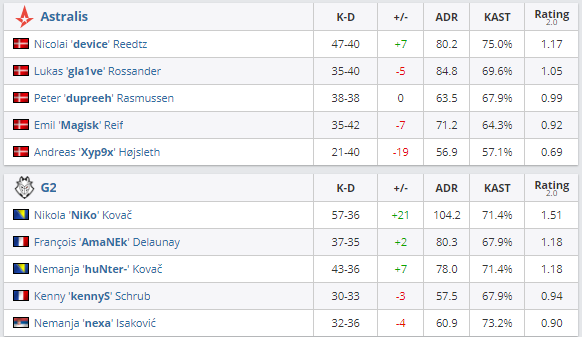 G2 обыграла Astralis в матче гранд-финала группы С регулярного сезона BLAST Premier: Fall 2020 по CS:GO со счетом 2:0. Обе команды получили путевку на BLAST Premier: Fall Finals, G2 за первое место забрала $25 000. Astralis же заработала $12 500.