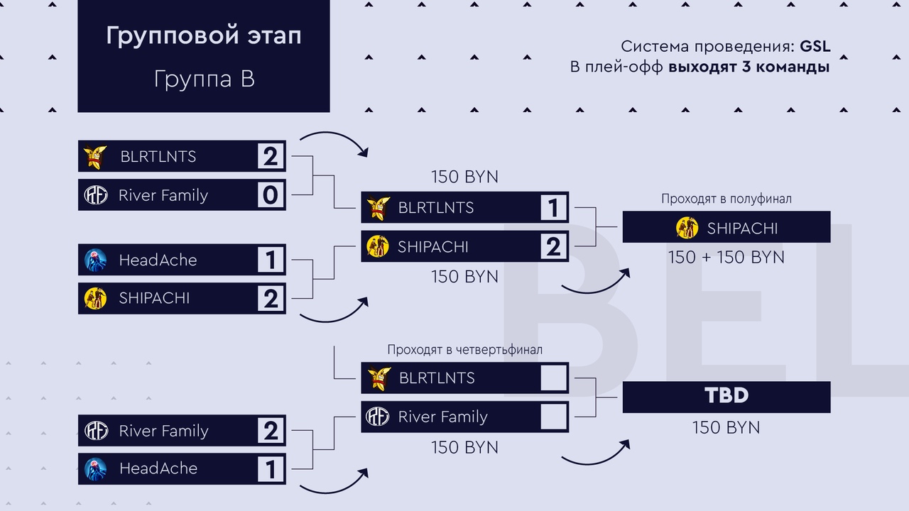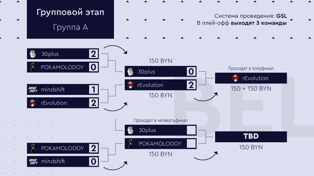 River Family, 30plus, POKAMOLODOY, BLRTLNTS проходят в четвертьфинал плей-офф. Командам осталось провести по одному матчу, итог которых решит посев коллективов и сколько призовых они унесут с группового этапа.