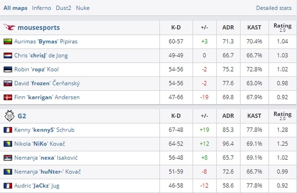 “Мышки” уступили со счетом 1:2, а G2 получила заветный билет в плей-офф турнира. Играли команды на картах Inferno, Dust2 и Nuke.