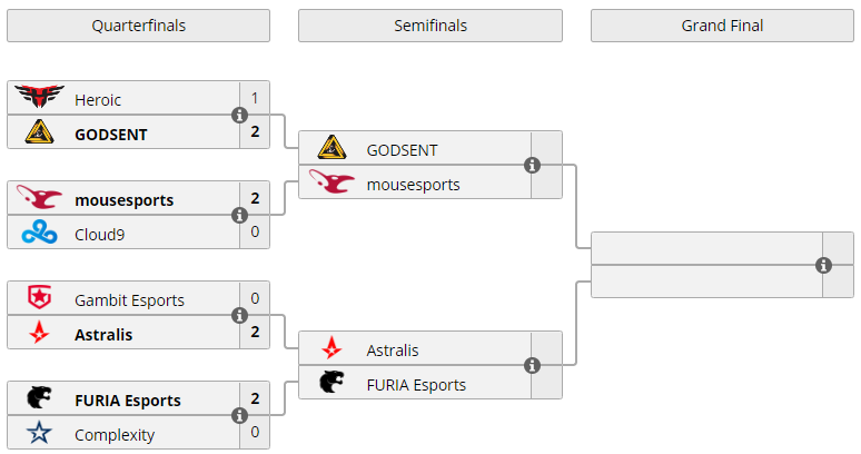В полуфинале DreamHack Masters Winter 2020: Europe сразятся GODSENT и mousesports. Проигравшая команда покинет турнир.