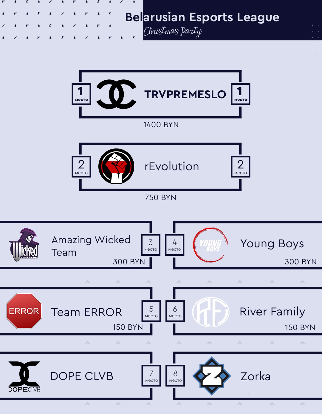 Команда TRVPREMESLO обыграла rEvolution со счетом 2:0 на Belarusian Esports League Christmas Party и выиграла главный приз 1400 BYN. “Революция” за вторую позицию забрала с соревнования 750 BYN.