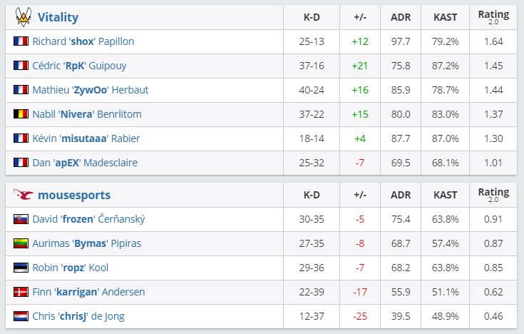 В четвертьфинале верхней сетки плей-офф BLAST Premier: Fall 2020 Team Vitality обыграла mousesports со счетом 2:0. Проигравшая команда упала в нижнюю сетку.