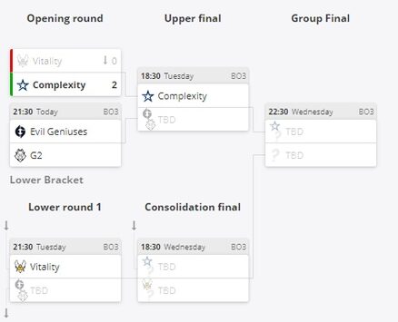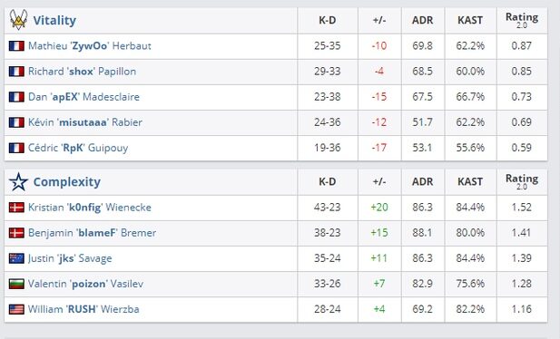 В матче второй группы BLAST Premier: Spring Groups 2021 сыграли команды Team Vitality и Complexity Gaming. Итоговый счет 2:0 в пользу Complexity.