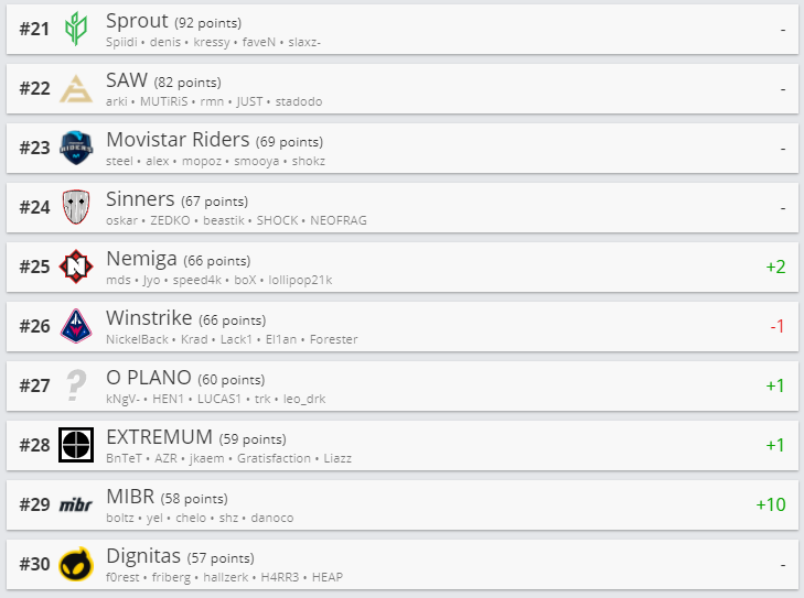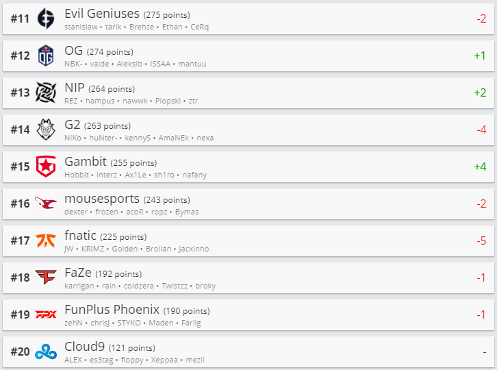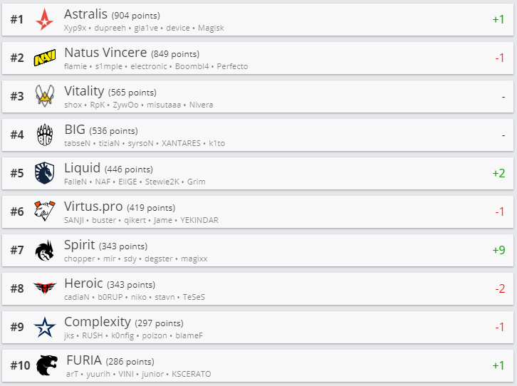 Белорусская команда Nemiga Gaming прибавила 2 позиции и расположилась на 25-ой строчке. Natus Vincere опустились на вторую строчку, уступив первое место Astralis. Третью позицию по прежнему занимает Team Vitality.