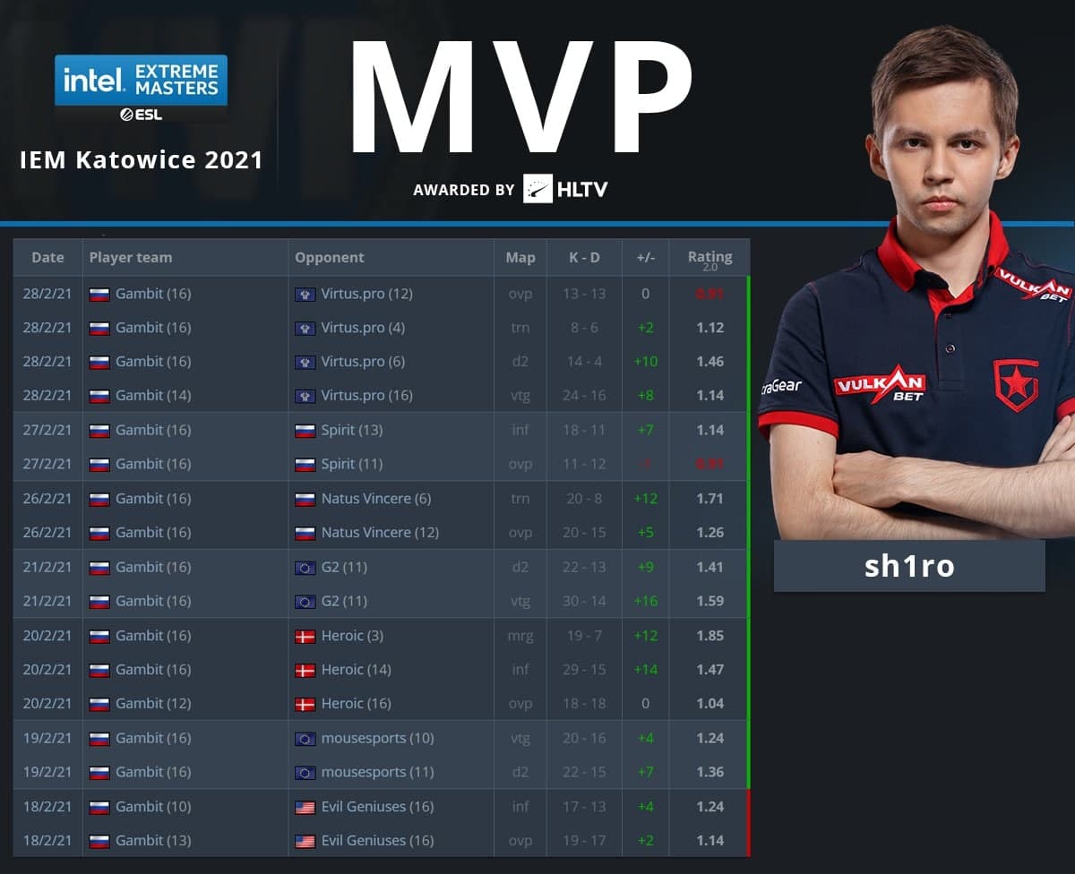 Дмитрий sh1ro Соколов, снайпер Gambit Esports, стал лучшим игроком Intel Extreme Masters Katowice 2021 по версии ресурса HLTV.org. По статистике он выиграл 90% клатчей, в которых участвовал. Для спортсмена это первая награда такого рода.