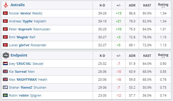 Коллектив Astralis одолел Endpoint в рамках матча группы “D” на ESL Pro League Season 13 со счетом 2:0. Astralis забрала лидерство у Virtus.pro в общем зачете и теперь находится на первом месте в группе.