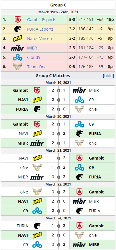 Сегодня завершились все игры в группе “C” ESL Pro League Season 13. Первое место заняла команда Gambit Esports. Она сыграет 8 апреля с победителем группы “D” матч за выход в полуфинал плей-офф.
